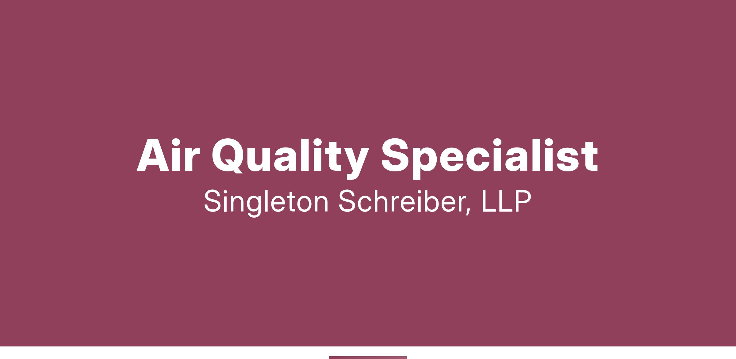 JOB DESCRIPTION: Singleton Schreiber seeks an Air Quality Specialist to support its environmental and toxic torts litigation in a large firm setting. The Air Quality Specialist plays an integral part in assisting attorneys in collecting, investigation and analyzing environmental data for case selection, pre-litigation, and litigation processes of matters involving toxic exposure, property damage and medical monitoring claims caused by a wide range of toxic releases and emissions from industrial processes and manufacturing, landfills, and utility-caused fires. The Air Quality Specialist also provides explanations and understandings of the collected data and scientific literature and its application to cases. The ideal candidate has an excellent understanding of the increased health risks of exposure to hazardous air pollutants, emissions and dispersion modeling, and state and federal air quality regulations.