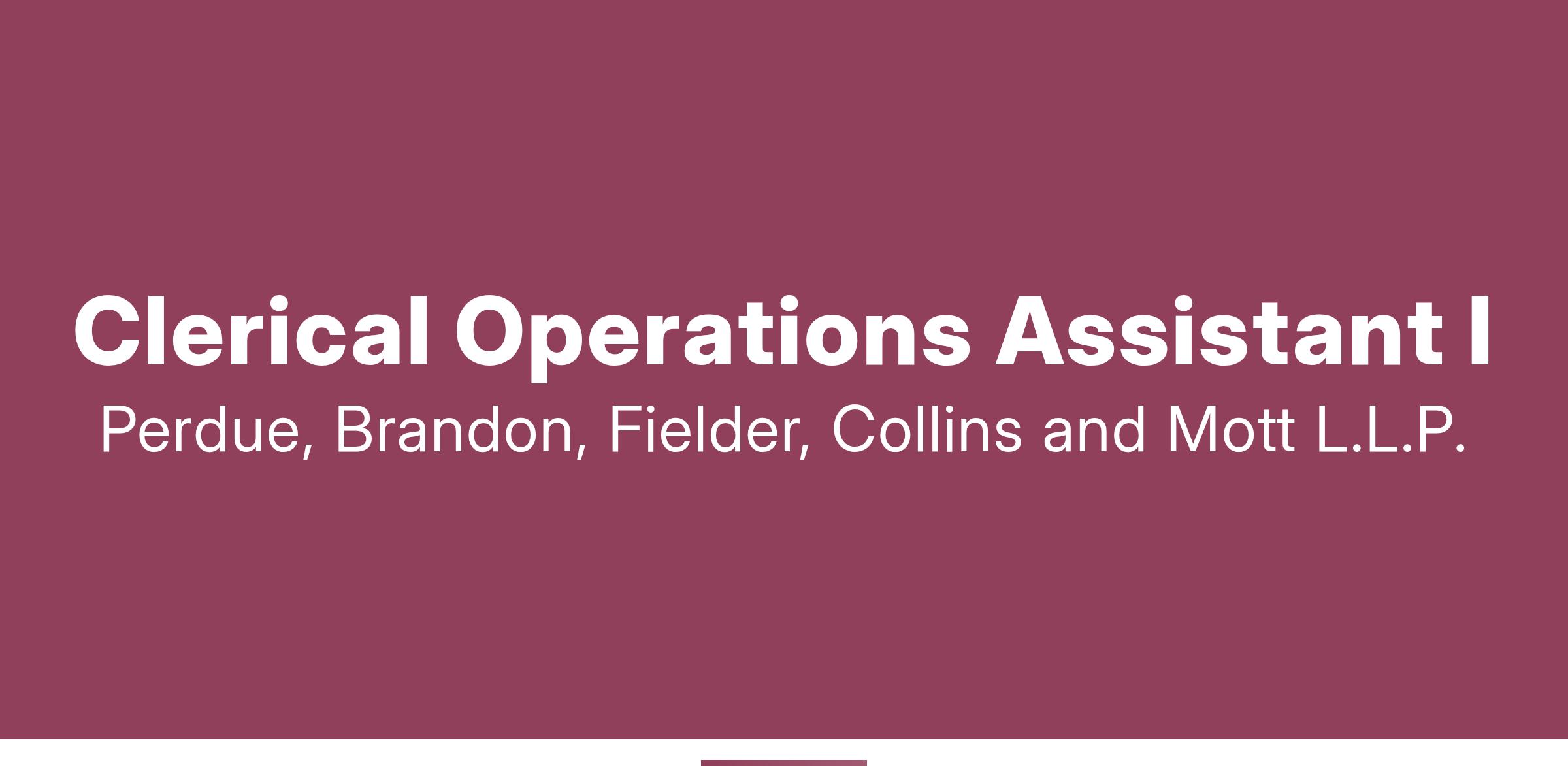 Perdue Brandon Fielder Collins & Mott, LLP in Austin TX is seeking to hire an enthusiastic full-time Clerical Operations Assistant I to perform various operational and clerical tasks to support our Operations team. The typical work schedule in our office is Monday - Friday, 8:30 am - 5:00 pm.