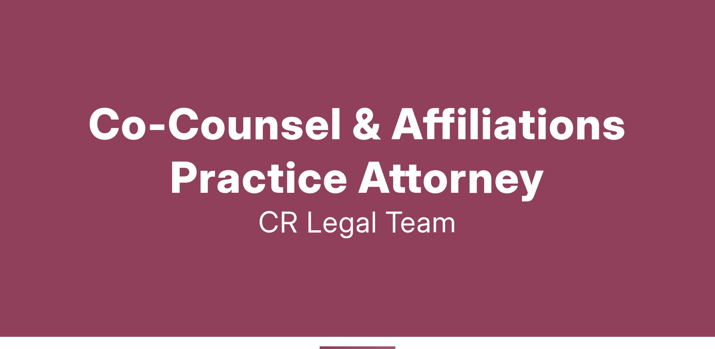 CR Legal Team is searching for a passionate, energetic, and experienced Co-Counsel & Affiliations Practice Attorney. Come join our Team and together we will be a force in advocating for our clients.