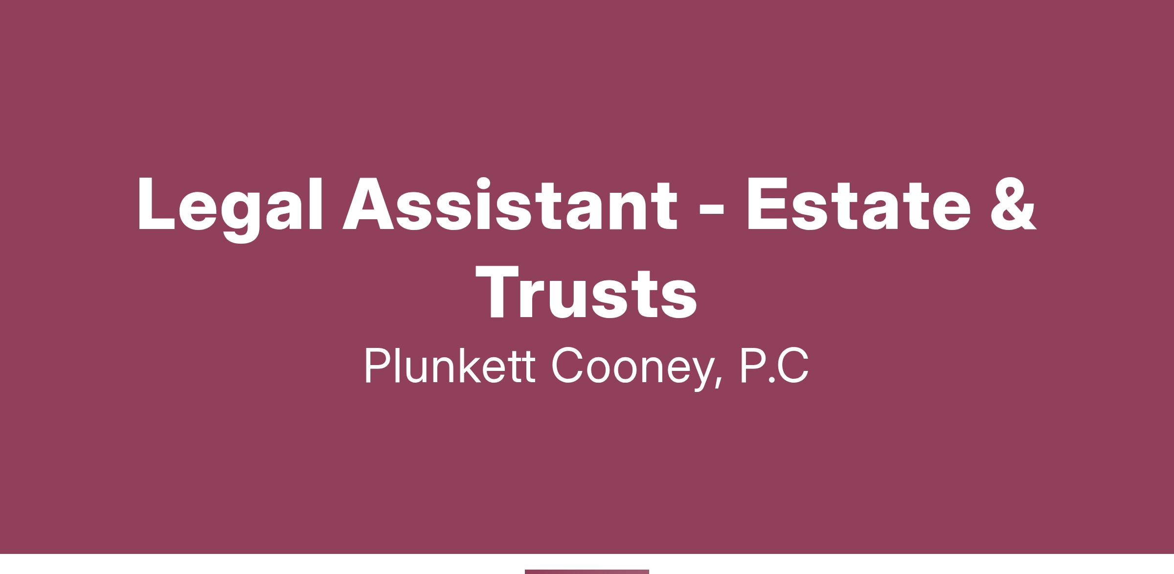 Plunkett Cooney is seeking a legal assistant to provide support to our growing Estate & Trust Practice Group. This group will consist of 3-4 attorneys and potentially more as the group grows.