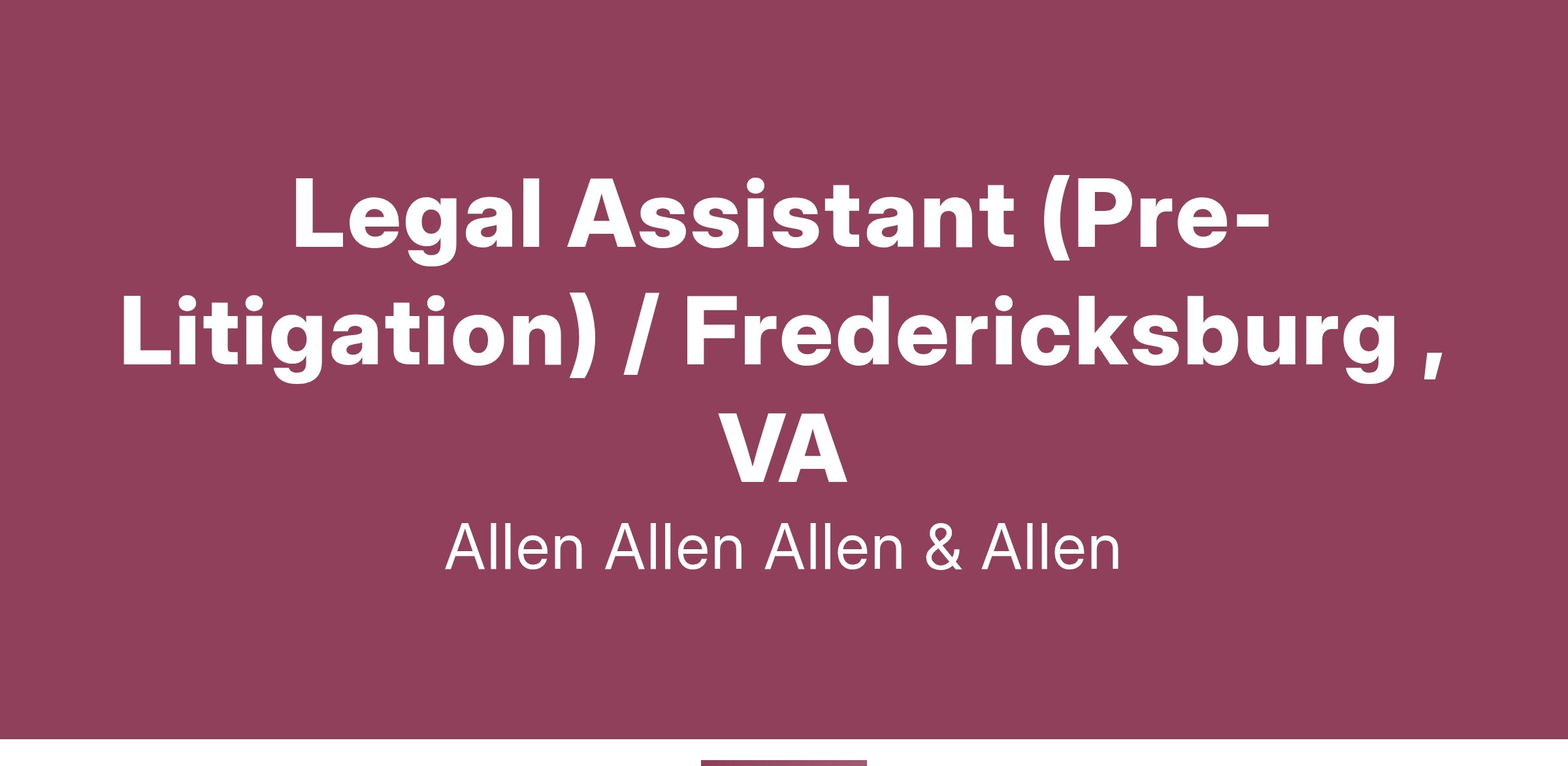 Allen & Allen is seeking an experienced Pre-litigation Paralegal/Legal Assistant for our Fredericksburg office to manage client case files. This includes providing excellent service and organizational skills to ensure our clients are receiving the best outcome for their case. Preferred background includes: