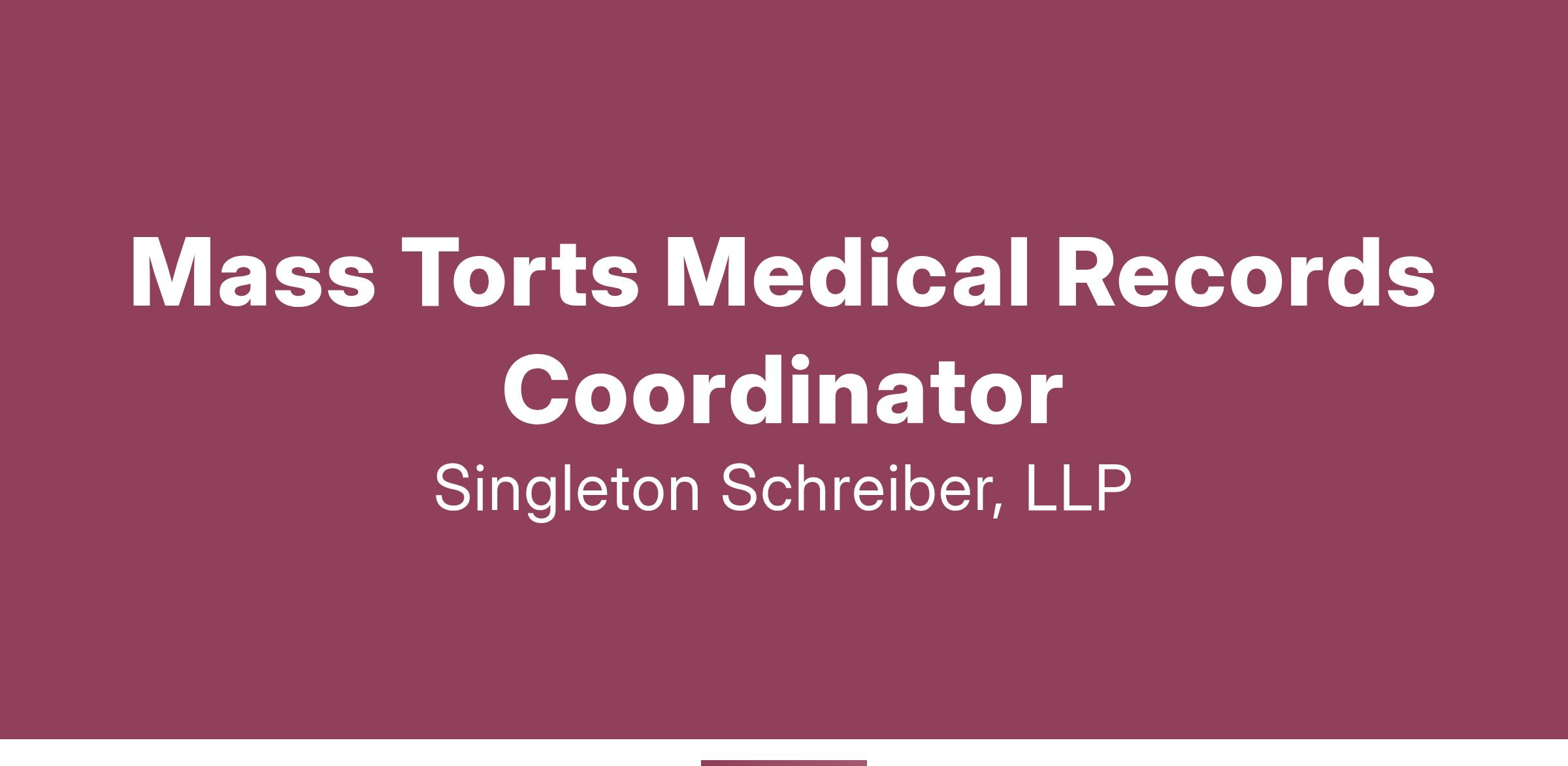 JOB DESCRIPTION: Singleton Schreiber, LLP is seeking a motivated, detail-oriented Medical Records Coordinator to join our Mass Torts team. This position is fast-paced and supports a team of attorneys doing regular litigation in state and federal courts. It will involve collaboration with other medical records coordinators, paralegals, and case assistants.