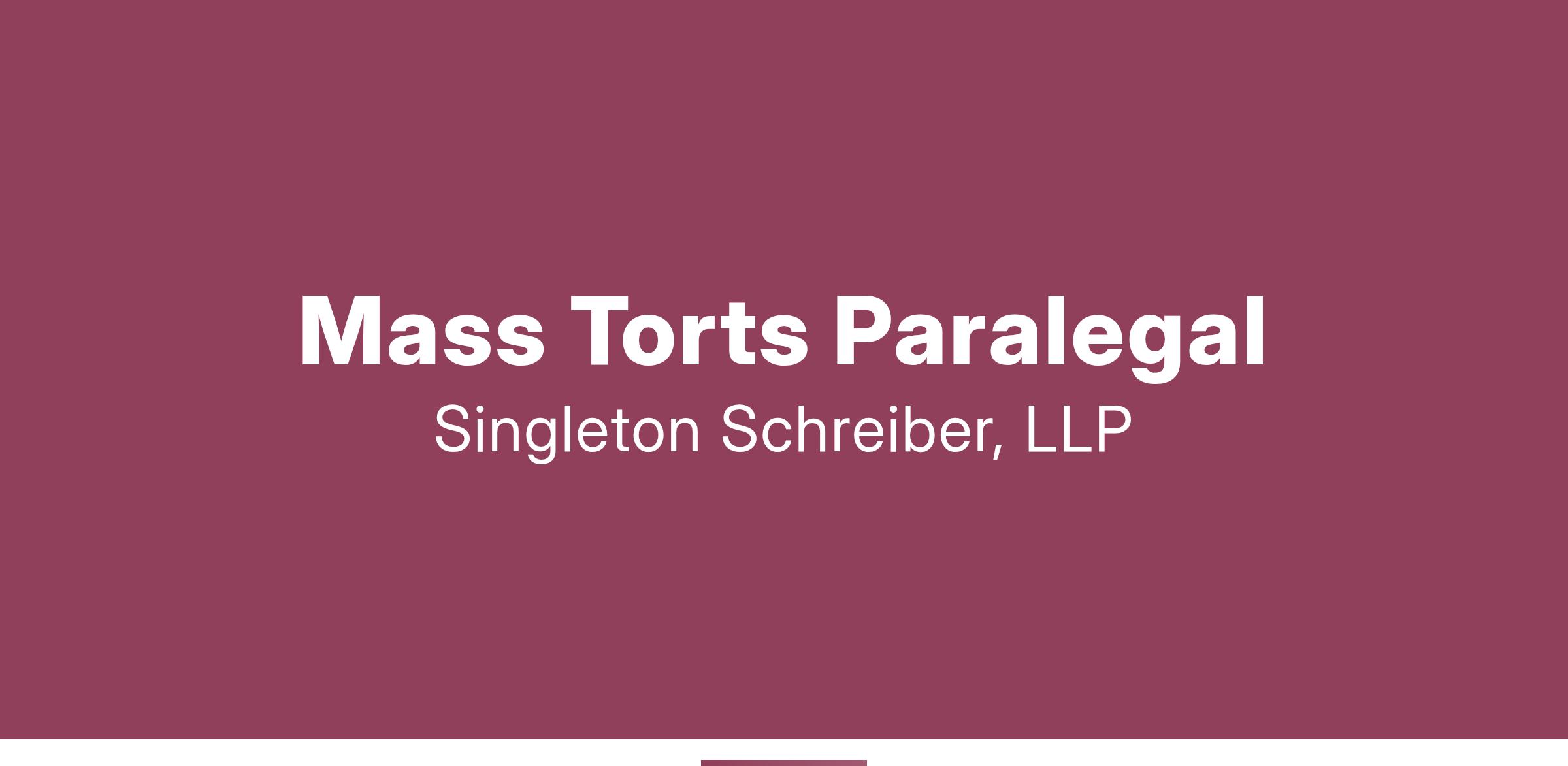 JOB DESCRIPTION: Singleton Schreiber, LLP is seeking an experienced, motivated, and detail-oriented paralegal to join our Mass Torts team. This position is fast-paced and supports a team of attorneys doing regular litigation in state and federal courts. It will involve collaboration of other paralegals and case assistants.