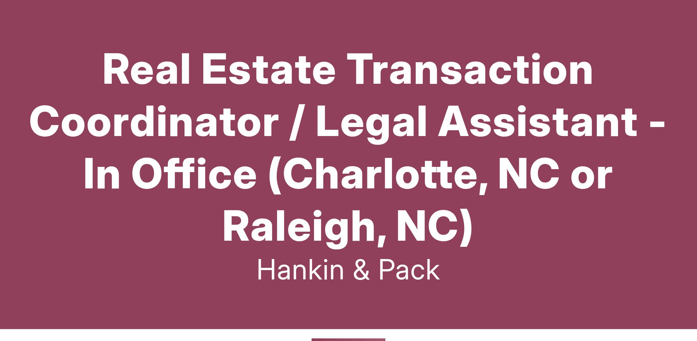 We are currently searching for a Real Estate Transaction Coordinator / Legal Assistant in our Raleigh, NC or Charlotte, NC office to join our growing team! You will assist in handling real estate activities and transactions on behalf of clients.