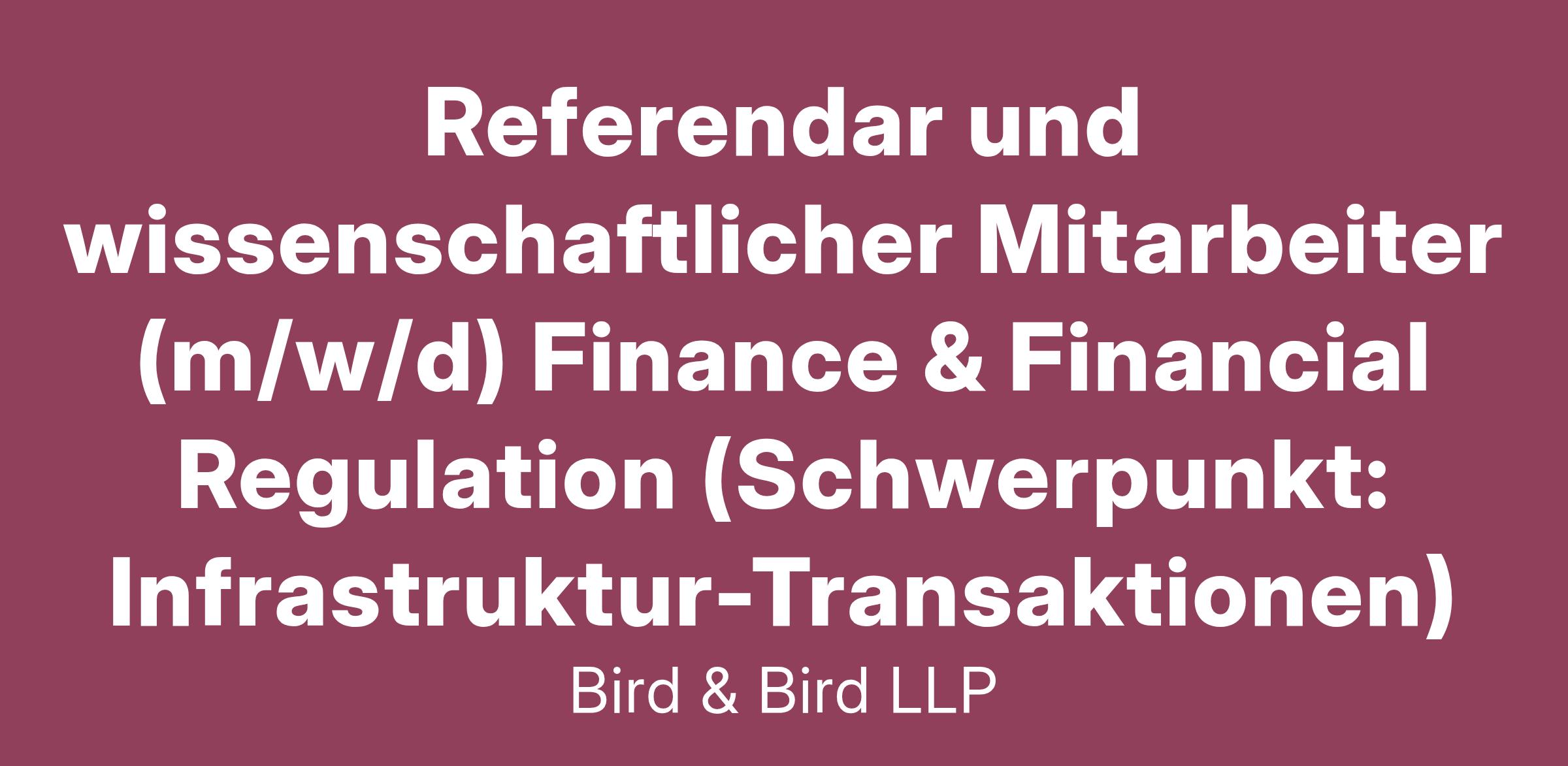 Unser Team im Bereich Finance & Financial Regulation mit dem Schwerpunkt der Investitionen in (und Finanzierung von) Projekten aus den Bereichen Verkehr, Energie, Logistik, Telekom und sonstige Infrastruktur begleitet mit multinationalen Teams grenzüberschreitende Transaktionen. Zu unseren Mandant:innen zählen Fonds, institutionelle Investoren, Unternehmen, Family-Offices, Investmentbanken, kommerzielle Banken, internationale Entwicklungsbanken und sonstige Investoren und Finanziers auf der ganzen Welt. Werden Sie Teil von Bird & Bird!