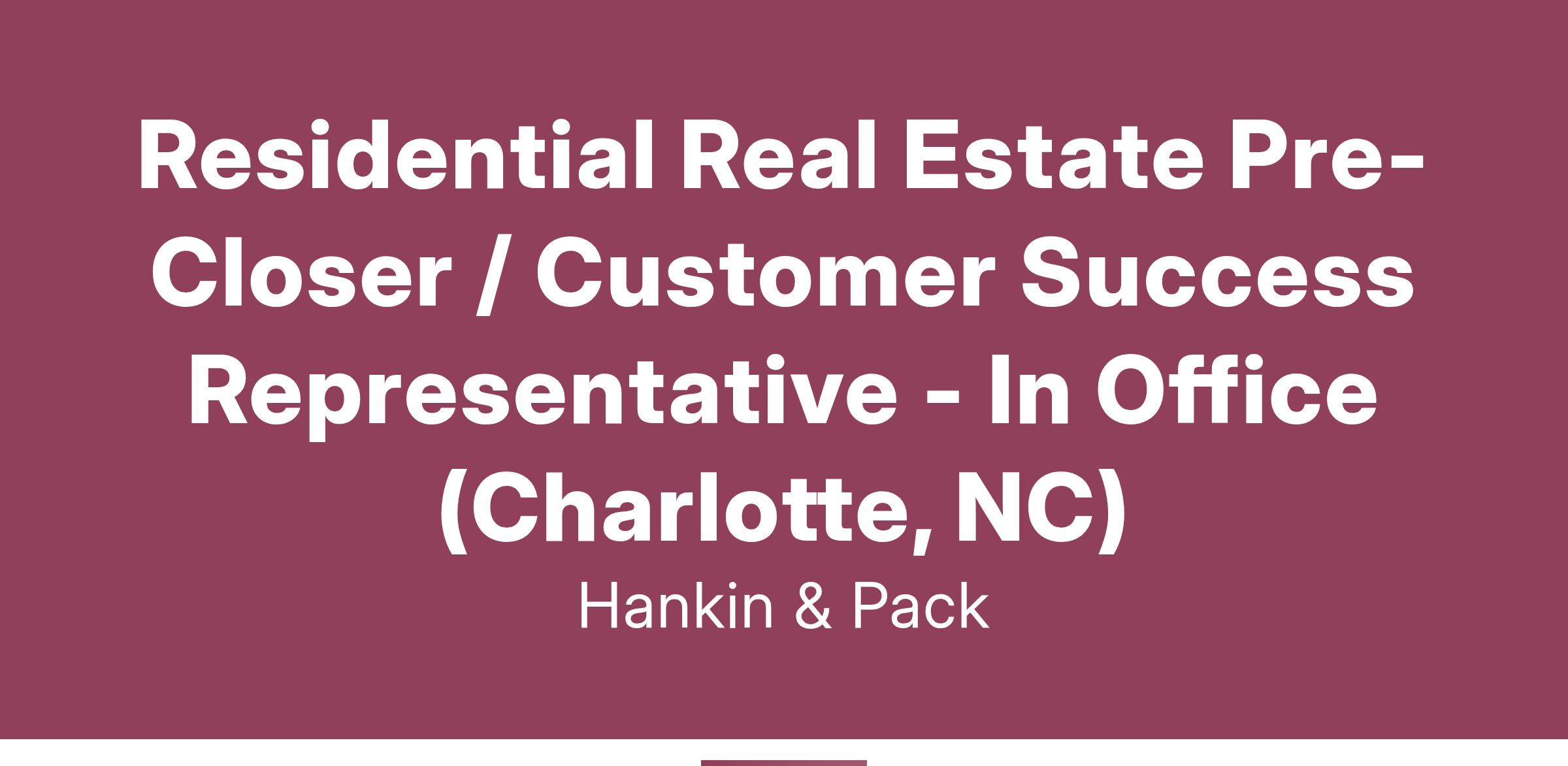 We are currently searching for a Residential Real Estate Pre-Closer / Customer Success Representative in our Charlotte, NC office to join our growing team! You will assist in handling real estate activities and transactions on behalf of clients.